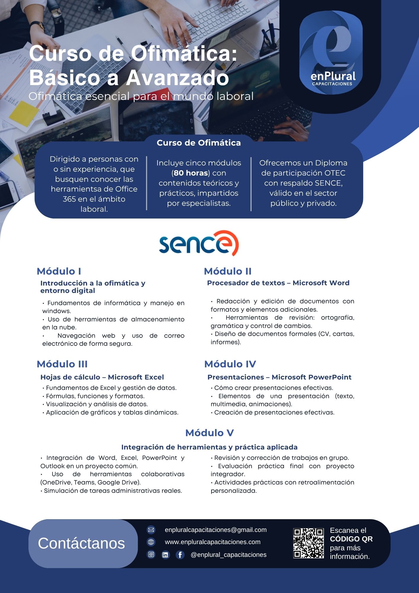 Curso de Ofimática Office 365 de básico a avanzado orientado a personas con o sin experiencia que buscan fortalecer sus habilidades digitales para el ámbito laboral. Incluye Word, Excel, PowerPoint, trabajo colaborativo, práctica aplicada y Diploma OTEC acreditada por SENCE.